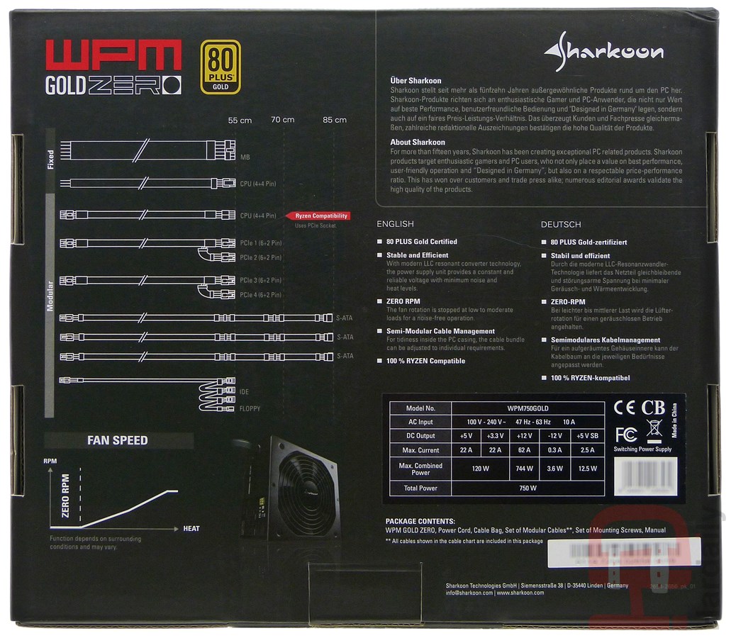 Sin embargo, la serie WPM Gold Zero se desmarca del resto, siendo fuentes ATX de cableado semimodular, con un precio más competitivo que la serie SilentStorm Cool Zero. En este artículo de análisis veremos la versión de 750W, el más potente de la serie. Esta fuente cuesta unos 85-90€ en las tiendas especializadas. Como su nombre indica, «Zero» hace referencia al silencio total de su ventilador de 140 mm cuando el PC conectado tenga una muy baja demanda de energía, en carga baja. Dada las diferencias de precio con su equivalente de la serie SilentStorm Cool Zero, parece evidente que la WPM Gold Zero poseerá otra circuitería algo más modesta de otro fabricante, y ligeras diferencias en prestaciones, como suelen ser las protecciones electrónicas internas (OVP, SCP y OPP). Es decir, si buscas una fuente de alimentación ATX de la más alta calidad de la marca, debes elegir la serie SilentStorm Cool Zero. Si buscas algo más modesto pero de calidad, la WPM Gold Zero de Sharkoon será una buena elección.